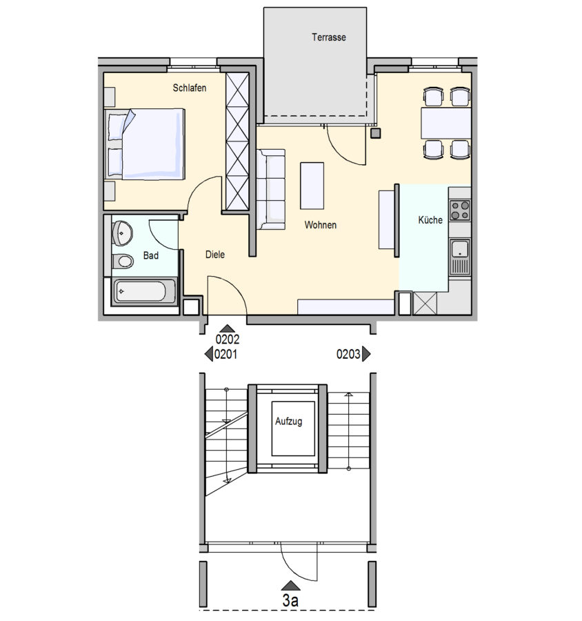 Die Wohnung ist mit Parkettboden, Fliesen und Raufasertapete ausgestattet. Die Wohnung verfügt über eine Terrasse (keine Gartennutzung).
