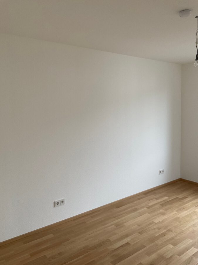 Die Wände und Decken sind mit Raufaser-Tapete tapeziert und weiß gestrichen.