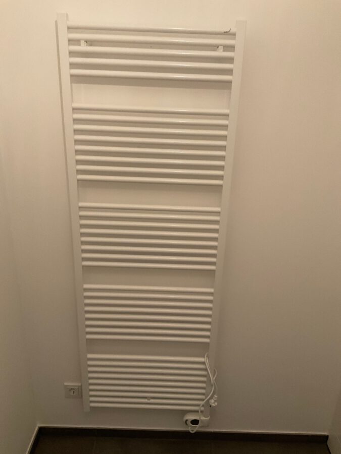Der Waschmaschinenanschluss befindet sich im Badezimmer.